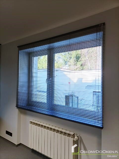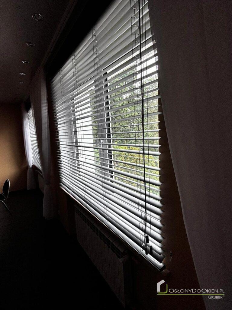 Żaluzje aluminiowe montowane do ściany są instalowane powyżej wnęki okiennej, co pozwala na pełne odsłonięcie okna po ich podniesieniu.
